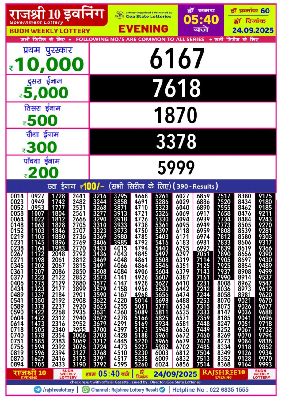 Rajshree 10 Evening Budh Weekly Lottery 5.40pm Result 24/09/2025 September 24, 2025 Leave a Comment on Rajshree 10 Evening Budh Weekly Lottery 5.40pm Result 24/09/2025 24 September 2025 5.40pm – Goa state Rajshree 10 lotteries 5.40pm Result has been declared for 24/09/2025 . First prize rs 10,000 Winning Ticket 6167 went unsold Today . Rest of the result is published here for your reference.