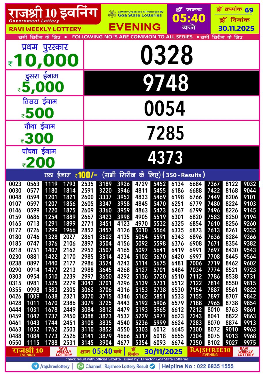 Rajshree 10 Evening Ravi Weekly Lottery 5.40pm Result 30/11/2025 November 30, 2025 Leave a Comment on Rajshree 10 Evening Ravi Weekly Lottery 5.40pm Result 30/11/2025