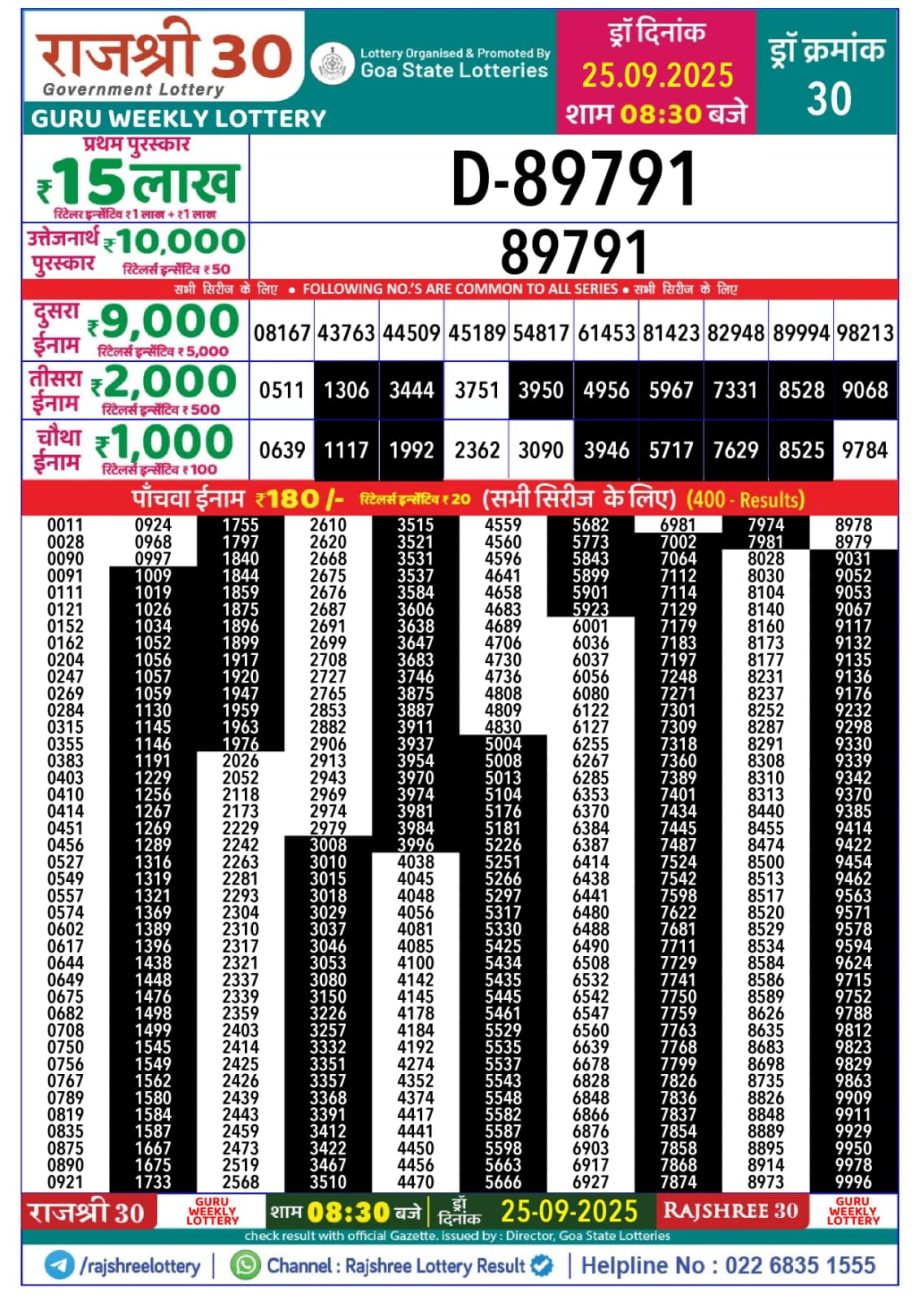 Rajshree 30 Guru Weekly Lottery 8.30pm Result 25/09/2025 September 25, 2025 Leave a Comment on Rajshree 30 Guru Weekly Lottery 8.30pm Result 25/09/2025 25 September 2025 8.30pm – Goa state Rajshree 30 lotteries 8.30pm Result has been declared for 25/09/2025 . First prize rupees 15 lakh Winning Ticket D- 89791 was went unsold Today . Rest of the result is published here for your reference.