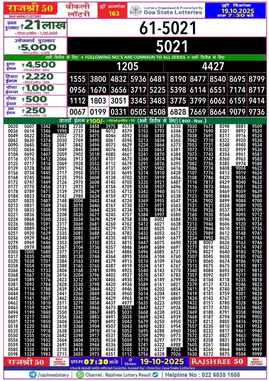 Rajshree 50 Ravi Weekly Lottery 7.30pm Result 19/10/2025 October 19, 2025 Leave a Comment on Rajshree 50 Ravi Weekly Lottery 7.30pm Result 19/10/2025