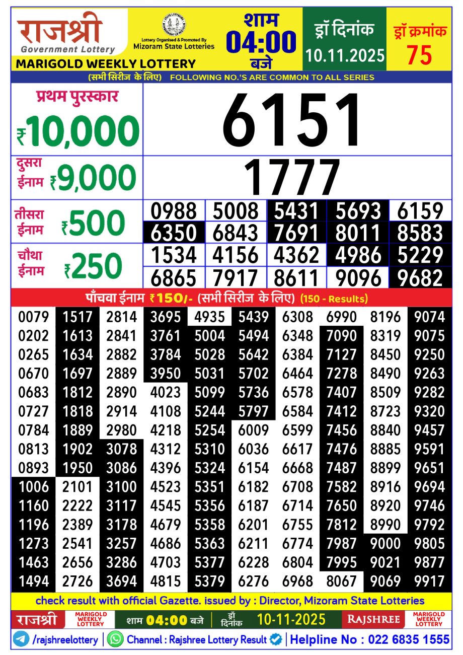 Rajshree Marigold Weekly Lottery 4pm Result 10/11/2025 November 10, 2025 Leave a Comment on Rajshree Marigold Weekly Lottery 4pm Result 10/11/2025