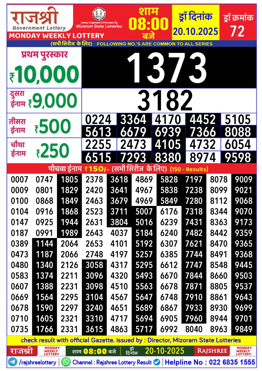 Rajshree Monday Weekly Lottery 8pm Result 20/10/2025 October 20, 2025 Leave a Comment on Rajshree Monday Weekly Lottery 8pm Result 20/10/2025