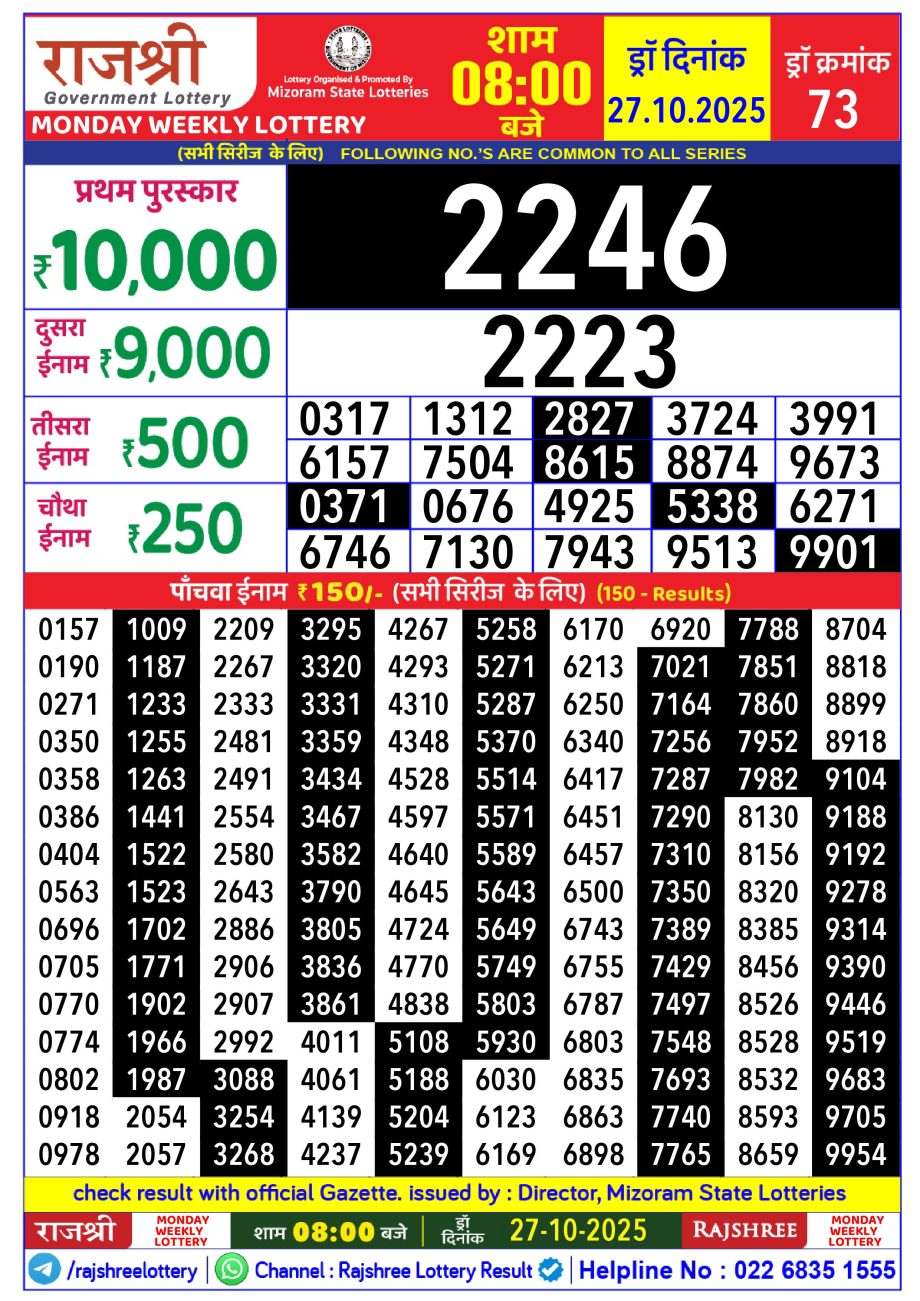 Rajshree Monday Weekly Lottery 8pm Result 27/10/2025 October 27, 2025 Leave a Comment on Rajshree Monday Weekly Lottery 8pm Result 27/10/2025