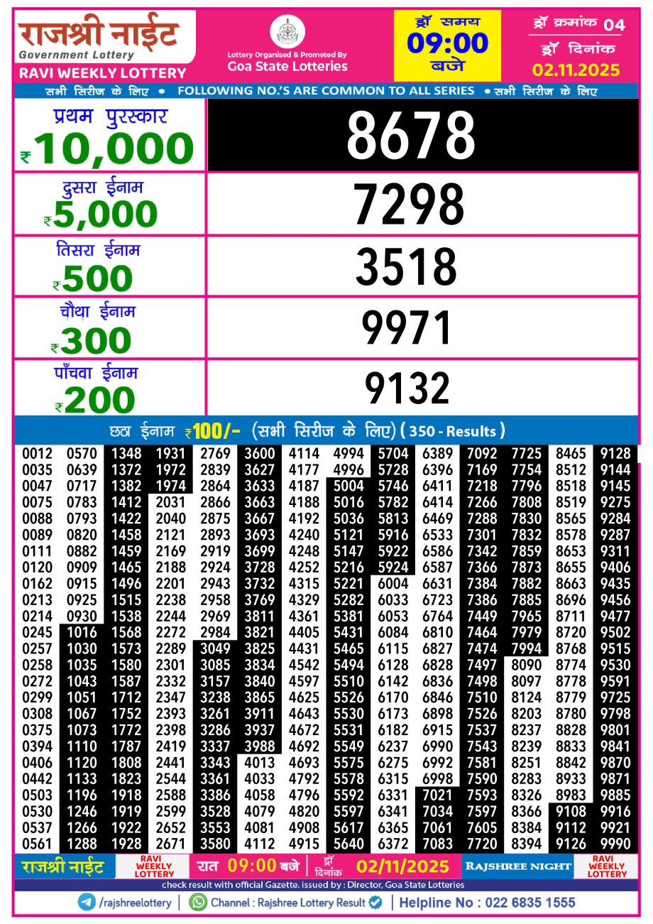 Rajshree Night Ravi Weekly Lottery 9pm Result 02/11/2025 November 2, 2025 Leave a Comment on Rajshree Night Ravi Weekly Lottery 9pm Result 02/11/2025