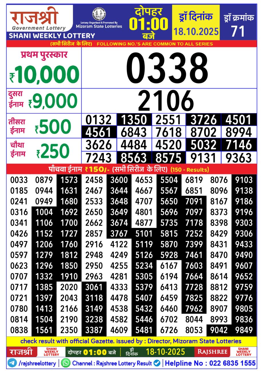 Rajshree Shani Weekly Lottery 1pm Result 18/10/2025 October 18, 2025 Leave a Comment on Rajshree Shani Weekly Lottery 1pm Result 18/10/2025