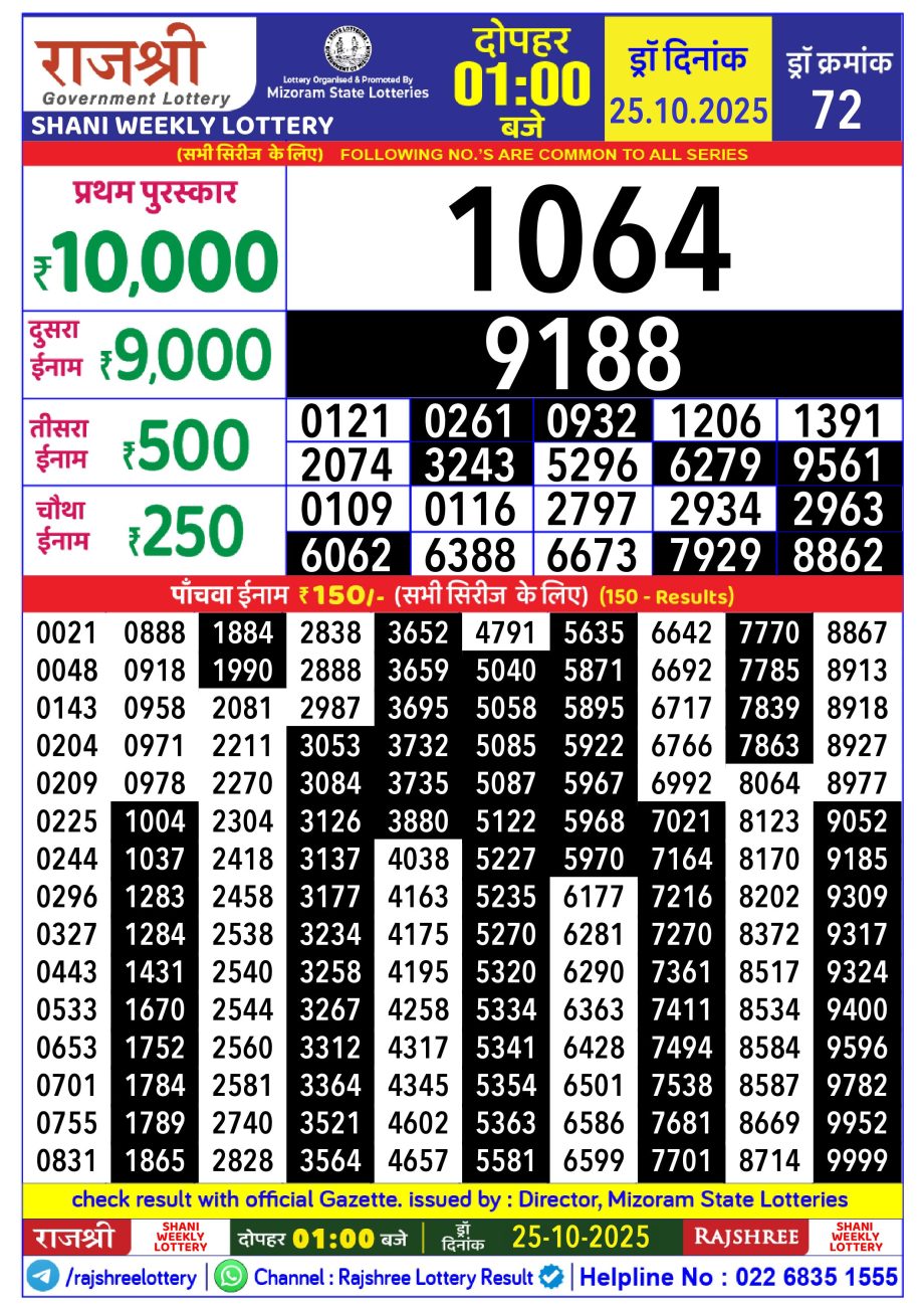 Rajshree Shani Weekly Lottery 1pm Result 25/10/2025 October 25, 2025 Leave a Comment on Rajshree Shani Weekly Lottery 1pm Result 25/10/2025