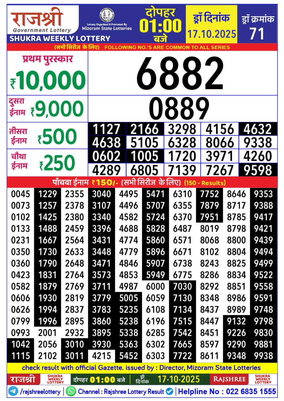 Rajshree Shukra Weekly Lottery 1pm Result 17/10/2025 October 17, 2025 Leave a Comment on Rajshree Shukra Weekly Lottery 1pm Result 17/10/2025