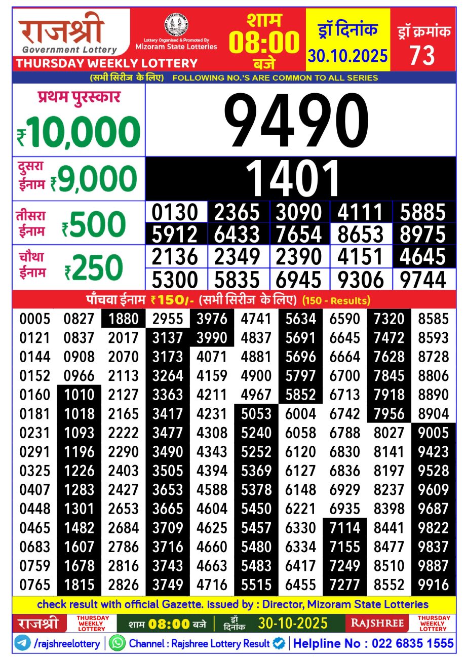 Rajshree Thursday Weekly Lottery 8pm Result 30/10/2025 October 30, 2025 Leave a Comment on Rajshree Thursday Weekly Lottery 8pm Result 30/10/2025