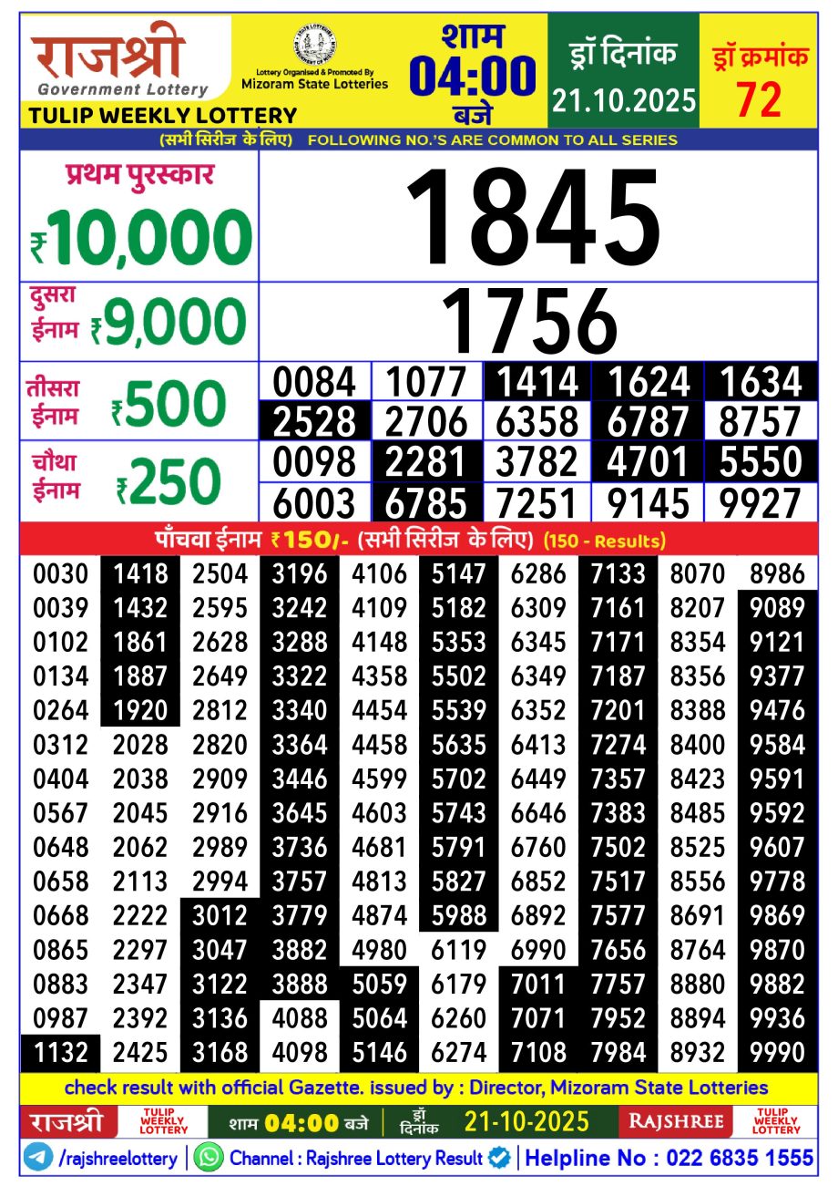 Rajshree Tulip Weekly Lottery 4pm Result 21/10/2025 October 21, 2025 Leave a Comment on Rajshree Tulip Weekly Lottery 4pm Result 21/10/2025